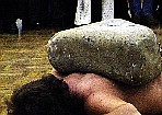 Jackisch wird eine hängende Steinplatte der Länge nach teilen. Das Konzentration