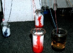 Farben über Wollfäden in andere, tiefer stehende Gläser mit weißen Substanzen