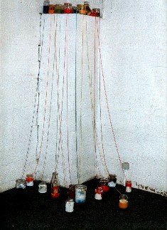 Schamp installiert eine Farbfließabrbeit, in der aus vielen Gläsern verschiedene
